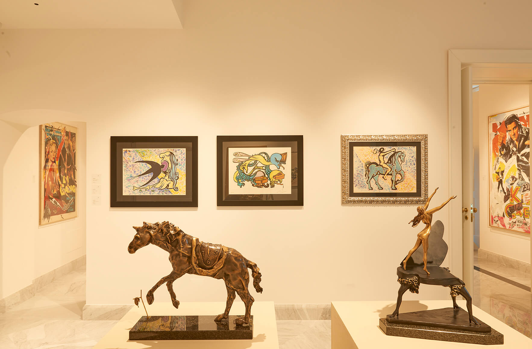 Da Salvador Dalì, in accordo con la Fondazione Dalì Universe, con la tridimensionalità delle sculture in bronzo del maestro spagnolo messa a confronto con le sue opere su carta in un percorso unico, a un gruppo di opere selezionate dal Fondatore della Fondazione VAF, Volker Feierabend, che rappresenterà la pittura del Novecento italiano. Una terza sezione della mostra inaugurale sarà dedicata alla Pop Art raccontata attraverso gli esponenti più rappresentativi del movimento, Andy Warhol, Mimmo Rotella, Mario Schifano e Giosetta Fioroni. La collezione raccoglie un nucleo di opere varie anche di grandi dimensioni che daranno l’opportunità al fruitore di confrontarsi tra le potenti espressività artistiche e la superficie espositiva storica di Palazzo Greco Stella. In contrapposizione al linguaggio pop italiano, nella quarta e ultima sezione, vengono raccontati gli artisti che hanno aderito al Movimento dell’Arte Povera: Giulio Paolini, Alighiero Boetti, Luciano Fabro, Mario Merz, Fausto Melotti. Gli stessi si rincorrono attraverso opere realizzate su carta provenienti dalla più importante collezione di Arte Povera al mondo: la Collezione Christian Stein. Chiudono questa sezione, due opere dell’artista che nell’ultimo decennio ha collaborato ai progetti istituzionali della Collezione: Mimmo Paladino. Arte a Palazzo darà la possibilità di visitare inoltre la Collezione permanente che annovera opere di Andy Warhol, Damien Hirst, Mimmo Rotella, Giosetta Fioroni, Sandro Chia e altri.